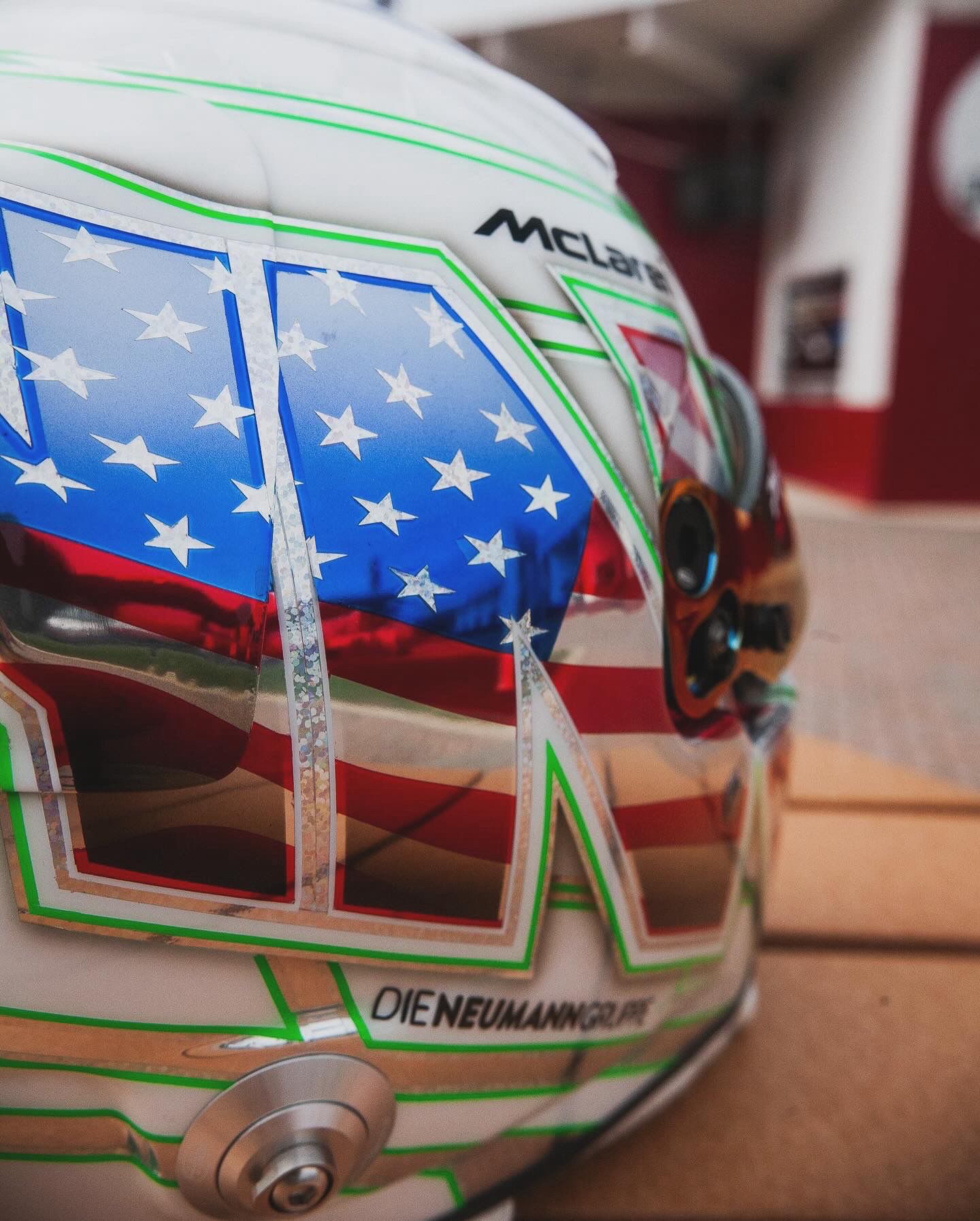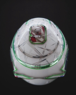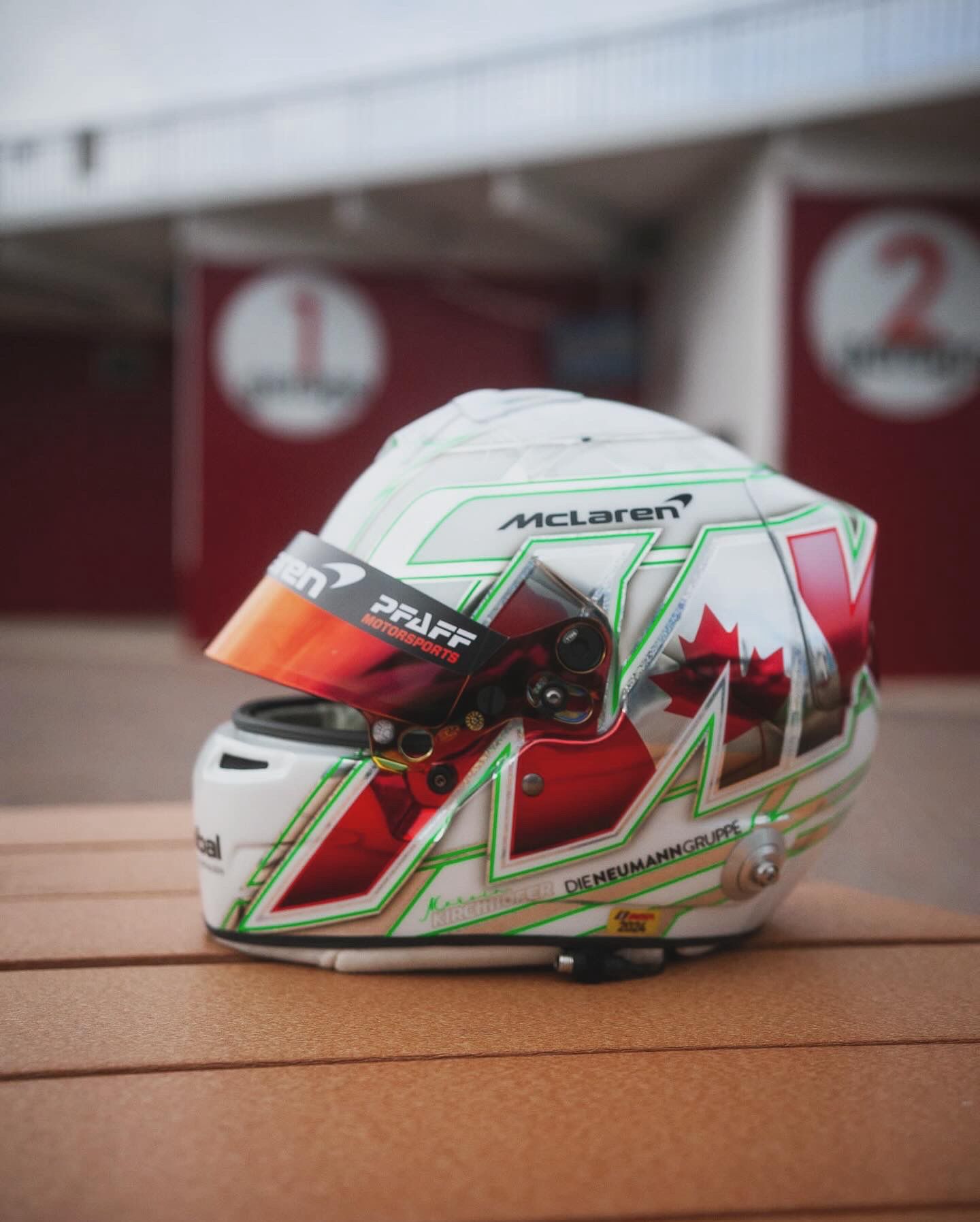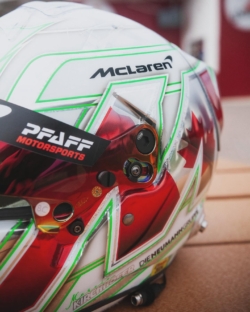 „Für mich hat sich dieses Jahr ein Traum erfüllt, welcher mir das Team Pfaff Motorsports ermöglicht hat. Wenn man noch nie ein Rennen in den USA erlebt hat, kann man sich dies kaum vorstellen, was es heißt für ein Rennfahrer hier fahren zu dürfen. Die Atmosphäre, die Fans und das ganze Drumherum, ist einfach unglaublich. Und dann noch für ein Team wie Pfaff Motorsports antreten zu können, ist nicht einfach mit Worten zu beschreiben. Daher habe ich mir Gedanken gemacht, wie ich dies zum Ausdruck bringen kann. Als Anerkennung für die Möglichkeit und Aufnahme in das Team, habe ich ein besonderes Helmdesign entwerfen lassen. Auf der einen Seite erkennt man in meinem bekannten MK-Logo die kanadische Flagge zu Ehren des Teams, das seinen Sitz in Kanada hat und auf der anderen Seite die amerikanische Flagge für die Serie, die zum größten Teil in den USA ausgetragen wird. Oben auf dem Helm die Startnummer unseres McLarens mit der Nummer #9, ebenfalls mit der kanadischen Flagge für das Team. Ich finde das Design ist echt gut gelungen. Vielen Dank hierfür auch an Jens Munser, der auch für viele Formel-1- Piloten die Helme designt.“ Marvin Kirchhöfer